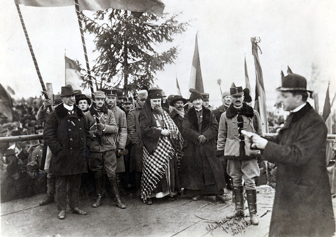 Marea Adunare Naţională de la Alba Iulia din 1 Decembrie 1918. Episcopul greco-catolic Iuliu Hossu, în faţa a peste 100.000 de participanţi, dă glas rezoluţiei Adunării Naţionale prin care se decreta unirea tuturor teritoriilor locuite de români cu România